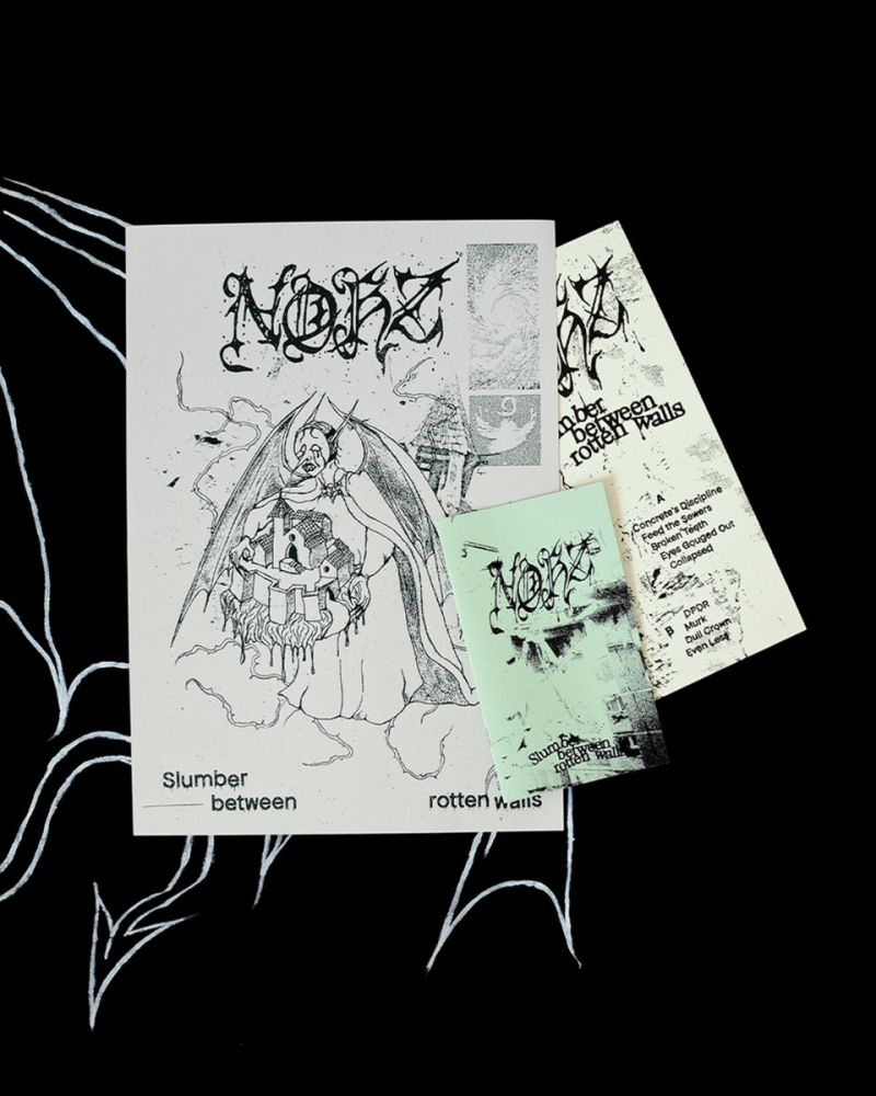"With screeching, blown-out vocals hovering over guitar feedback and stomp-inducing drum parts, Toulouse, France NOHZ’s first full length feels equally playful and sinister, borrowing from hardcore punk acts such as HOAX as well as early Scandinavian black metal (think DARKTHRONE), not unlike what RAW MOON did back in 2010. Compared to their 2022 demo, Slumber Between Rotten Walls features more experimentation with chaotic noise layers and nasty mid-tempo parts to roughhouse to ; a sure-fire way to leave you all wired and out of breath, wanting to spin that LP all over again." - Léon (Fleckentarn)